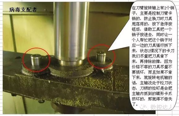 好了,当你把2把刀具都拿下来了,现在基本上状态1的卡刀和状态2的卡刀,都可以用同一步骤进行解决了。 1.需要2人协调操作,一人爬到设备刀库上,下面一个关注刀臂情况,刀库上有一个换刀机械手臂电机(刀臂正上方的一个马达) 2.松开电机上的刹车装置(没松开是扭不动电机手臂的),用活动扳手旋转电机上的外六角,一般旋转的方向和刀臂的卡死的方向相同,总之就是让刀臂脱离主轴刀具。在上面的人旋转刀臂的同时,下面的人一定要注意刀臂旋转的方向,及时提醒上面操作的人,因为他看不到实际情况的。 3.在刀臂脱离主轴时,如果主轴上有刀具(即状态1),您有听见了漏气声(就是主轴处于松刀状态),就要注意,在工装上垫个东西,刀具可能会掉下来的(千万不要用手去抓,很危险)。